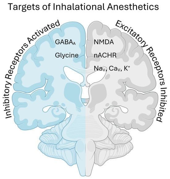 Four main criteria are used to identify molecular targets of anesthetic action: the anesthetic must reversibly and directly alter the target’s function at clinically relevant concentrations; the target must be expressed at specific anatomic locations that mediate the anesthetic’s functions; stereoselective effects on the target must be consistent between in vivo and in vitro experiments; and finally, pharmacologic or genetic disruptions that alter anesthetic sensitivity must abolish the anesthetic effect at that specific site [40]. Putative targets include inhibitory receptors such as GABAA and glycine, excitatory receptors such as NMDA and nicotinic acetylcholine receptors (nACHR), potassium channels (K+), and voltage-gated sodium (Nav) and calcium (Cav) channels (Figure 2).