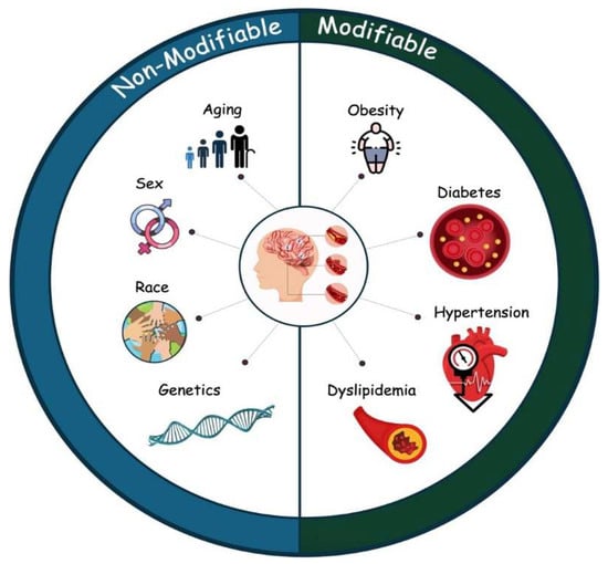 The endothelial dysfunction underpinning ischemic stroke is triggered by several risk factors, which can be broadly classified as modifiable and non-modifiable (Figure 1). Non-modifiable risk factors include age, sex, ethnicity, and genetics. Modifiable risk factors include metabolic determinants, such as dyslipidemia, hypertension, insulin resistance, and obesity. Addressing these metabolic determinants through lifestyle modification, such as diet, exercise, and pharmacotherapy is essential in reducing cerebrovascular risk and preventing or delaying the onset of cerebrovascular diseases.