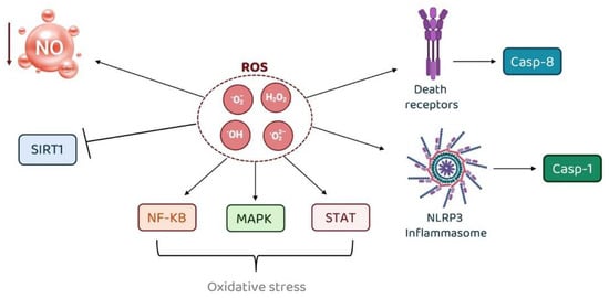 ROS also activate several signaling pathways involved in inflammation and vascular remodeling, such as NF-κB, MAPKs, and STAT, contributing to oxidative stress [,]. This results in aberrant signaling and post-translational modifications, including the oxidation of proteins, which drives cell and tissue damage. In addition, ROS can inhibit protective enzymes like SIRT1 and lower NO bioavailability, further exacerbating endothelial dysfunction and promoting hypertension [].