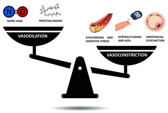 The imbalance towards vasoconstriction in diabetic patients depends not only on the lack of production of vasodilator mediators but also the increased production of vasoconstrictor ones: endothelin-1, for example, promotes smooth muscle cell hypertrophy through activation of the RAAS system (renin–angiotensin–aldosterone system), with consequent retention of water and salt. Moreover, serum levels of endothelin-1 in these patients are also higher in response to the insulin action of modulating gene expression and receptor synthesis, triggering a vicious circle that amplifies vascular constriction [].