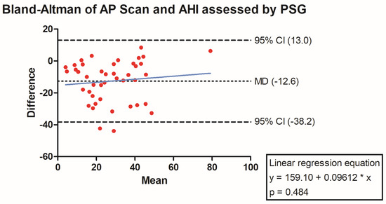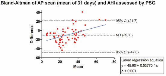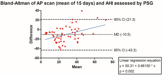 Bland–Altman plot showing the overestimation of the device-derived AP scan® compared to the apnea–hypopnea index by visualizing the mean of differences with their respective 95% confidence interval. Y-axis depicts the difference between the polysomnography-derived apnea–hypopnea index and the AP scan®, while the x-axis plots their mean. The fitted linear regression line demonstrates no form of proportionality bias.