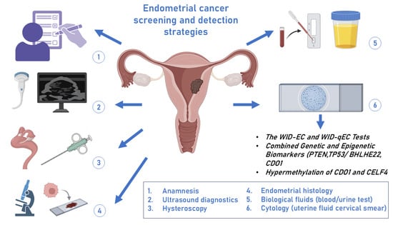 It is possible to obtain minimally invasive samples from peripheral blood, uterine lavage, cervicovaginal fluid, and other tumor-specific biofluids []. Gene sequencing of these biofluids can identify tumor-derived DNA, which could facilitate early tumor identification and subsequent early diagnosis of EC []. Current research is focused on developing less invasive approaches for the early detection of EC, particularly in conjunction with molecular testing. Significant progress has been made in this area in the past decades and we anticipate that less invasive methods will be effective for screening asymptomatic populations and improving current diagnostic protocols for high-risk and symptomatic women (Figure 1).