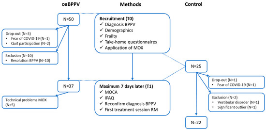 Flow charts of methods and selection process of participants. Abbreviations: oaBPPV, older adults with BPPV; Control, older adults in control group; BPPV, benign paroxysmal positioning vertigo; MOCA, montreal cognitive assessment; IPAQ, international physical activity questionnaire; RM; repositioning maneuver.