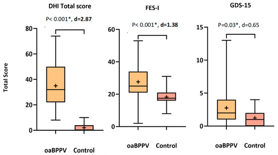 The DHI (total score and physical, emotional and functional subscale) was significantly higher in oaBPPV compared to controls (32 (8–74) vs. 0 (0–10)). OaBPPV also experienced significantly more fear of falling and feelings of depression according to the FES-I (25 (2–53) vs. 17.5 (8–31)) and GDS-15 (2 (0–13) vs. 1 (0–4)) (Figure 2). Cohen’s d of GDS-15 was too small (<0.69) according to sensitivity analyses, indicating that power is less than 80%.