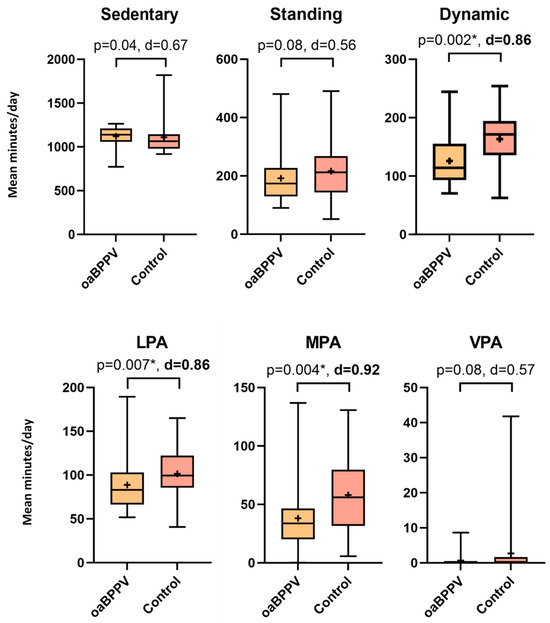 Mean minutes of physical activity classifications/day in older adults with BPPV (n = 32) compared to an age-, weight-, and height-matched controls (n = 22). The boxplots indicate the medians, interquartile range and minimum and maximum values, with the’+’ indicating the mean values. Significant p-values are indicated with ‘*’. Sufficiently large cohen’s d are indicated in bold. Abbreviations: oaBPPV, older adults with BPPV; Control, older adults in control group; LPA, low physical activity; MPA, moderate physical activity; VPA, vigorous physical activity.
