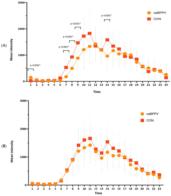 Distribution of the mean physical activity intensities per 24 h without (A) and with (B) 1-h time-shift in older adults with BPPV (n = 32) compared to an age-, weight-, and height-matched controls (n = 22). Significant p-values are indicated with ‘*’. Abbreviations: oaBPPV, older adults with BPPV; control, older adults in control group.