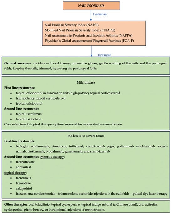 In cases of mild nail disease, first-line therapy is represented by topical calcipotriol in association with high-potency topical corticosteroid or high-potency topical corticosteroid or topical calcipotriol; the second-line therapy includes topical tacrolimus and topical tazarotene. In cases refractory to topical therapy, options reserved for moderate-to-severe disease should be considered [39].