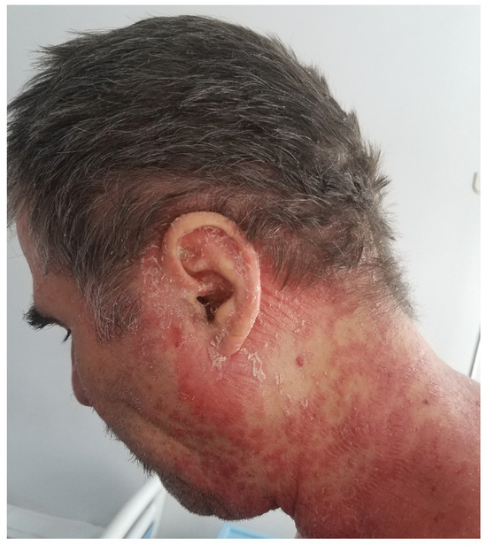 Scalp lesions are characterized by thickened, well-demarcated, squamous, erythematous plaques, frequently associated with itching. The lesions are typically located on the retro-auricular and cervical regions, even though they may appear anywhere on the scalp. The extent of the disease varies from fine scaling to thick erythematous crusted plaques on the entire scalp, typically crossing the hair line and affecting a small area of the adjacent facial skin. In severe cases, alopecia due to psoriatic plaques has been reported (Figure 5—scalp psoriasis: scalp involvement in a patient with psoriasis vulgaris) [47].