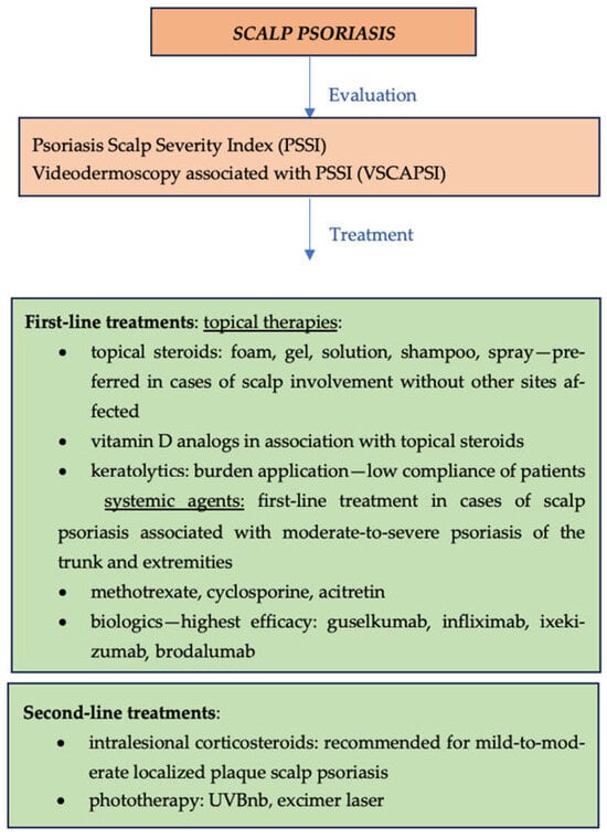 - Ghafoor, R.; Patil, A.; Yamauchi, P.; Weinberg, J.; Kircik, L.; Grabbe, S.; Goldust, M. Treatment of Scalp Psoriasis. J. Drugs Dermatol. 2022, 21, 833–837. [Google Scholar] [CrossRef]