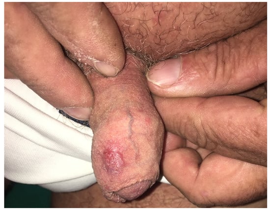 Genital psoriasis is clinically characterized by well-demarcated, erythematous, thin plaques with variable degrees of scaling. The specific features of the genital region, including warmth and moisture, are responsible for the local maceration and reduction in scaling. The most frequently reported symptom in genital psoriasis is pruritus, being an important debilitating symptom in many cases. Other reported clinical manifestations are represented by burning sensations and dyspareunia (Figure 7—psoriasis plaque of the genital region in a male patient) [57].