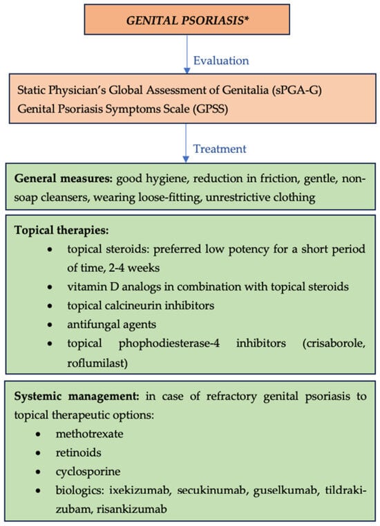 - Beck, K.M.; Yang, E.J.; Sanchez, I.M.; Liao, W. Treatment of Genital Psoriasis: A Systematic Review. Dermatol. Ther. 2018, 8, 509–525. [Google Scholar] [CrossRef] [PubMed]
