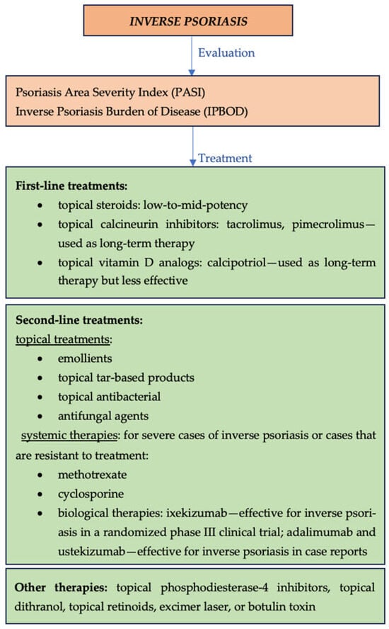 The assessment of inverse psoriasis may be conducted through PASI. Another useful tool used for evaluating the burden associated with inverse psoriasis is represented by the Inverse Psoriasis Burden of Disease (IPBOD) questionnaire, which evaluates aspects related to the quality of life of patients with inverse psoriasis [74].