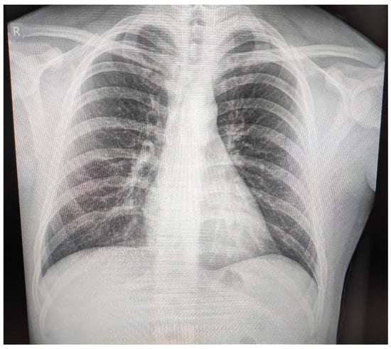 On his arrival at the emergency department, he was alert, with a temperature of 37.7 °C, blood pressure of 130/75 mmHg, regular pulse rate of 68 beats per minute, and oxygen saturation of 99% on room air without dyspnea. Physical examination revealed an alert man. The lung fields were clear on auscultation and a cardiovascular exam revealed a regular rate and rhythm with a normal S1 and S2 and no added sounds. His abdomen was soft, with mild tenderness. Chest radiography revealed no abnormal findings (Figure 1). Electrocardiography (ECG) showed a normal sinus rhythm with nonspecific repolarization disturbances (Figure 2).