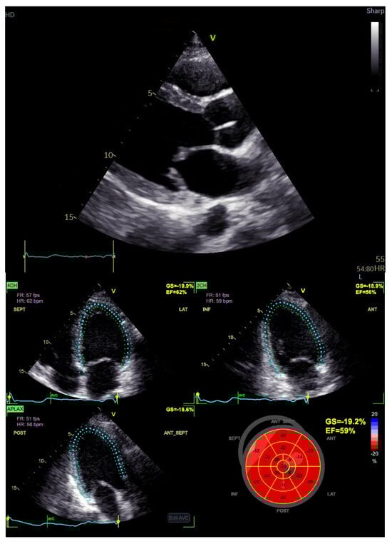 Transthoracic echocardiography findings in the patient, showing normal left-ventricular dimensions and contractility; upper panel, parasternal short-axis view; lower panel, left-ventricular ejection fraction and global longitudinal strain estimations. GS, global strain; EF, ejection fraction; 4CH, 4−chamber view; APLAX, apical long axis; 2CH, 2−chamber view; HR, heart rate; FR, frequency; SEPT, septal; LAT, lateral; INF, inferior; ANT, anterior; POST, posterior; ANT_SEPT, anteroseptal.