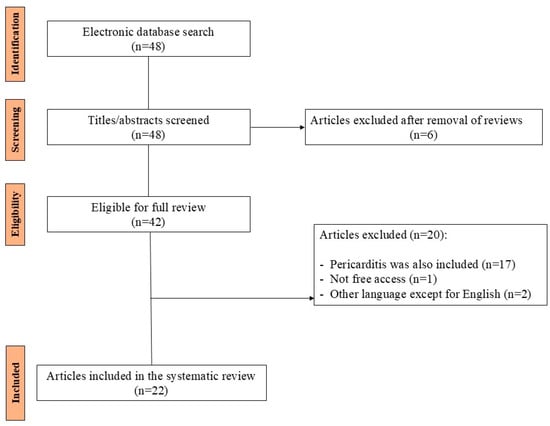 We performed a search on PubMed using the terms “Campylobacter jejuni” and “myocarditis”. Our search revealed 46 articles published from 1980 to 2024 (Figure 5). From these articles, we collected case reports that only included patients with myocarditis associated with Campylobacter jejuni. We excluded articles including patients with perimyocarditis and endocarditis, patients with other types of Campylobacters, articles that were in languages other than English, and articles that were not free. We found a total of 25 cases of Campylobacter jejuni-related myocarditis that have been described in the literature, from 22 articles [9,11,12,13,14,15,16,17,18,19,20,21,22,23,24,25,26,27,28,29,30,31].