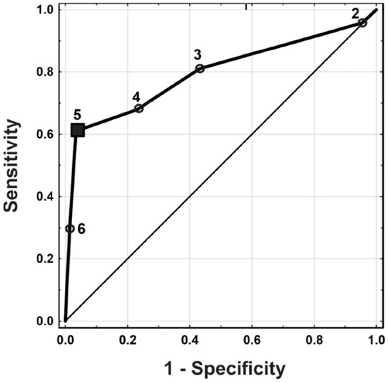 The PPVs for criterion 5 (categories VI and VI), criterion 4 (categories VI, V, and IV), and criterion 3 (categories VI, V, IV, and III) were 0.92, 0.66, and 0.55, respectively. Based on the ROC curve, criterion 5 (i.e., Bethesda category V and VI tumors) was associated with the presence of thyroid cancer with a specificity of 0.97 and a sensitivity of 0.61. Criterion 5 represents the cut-off point associated with a higher risk of malignancy.