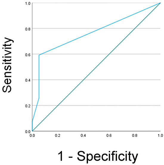 NGAL Detection and Clinical Outcome: To determine the association between clinical outcomes and NGAL detection via the human NGAL XpressCard in confirmed AKI diagnosis using KDIGO criteria, we determine the sensitivity, specificity, negative predictive value, and positive predictive value for AKI. Receiver operating characteristic (ROC) curve analysis was performed to identify the optimal cutoff value of uNGAL levels, sensitivity, specificity, and positive and negative predictive value for the prediction of AKI (Figure 1). The area under the curve (AUC) was calculated to assess the test’s accuracy, resulting in a value of 0.763 ± 0.072, with p = 0.003. Using a cutoff value of 25.00, the sensitivity and specificity of uNGAL for detecting acute injury were 59.3% and 95.8%, and positive and negative predictive values were 92.9% and 71.9%, respectively. Of the 22 patients with confirmed AKI diagnosis, uNGAL protein expression levels were present in 59.3% of the subjects (13/22).