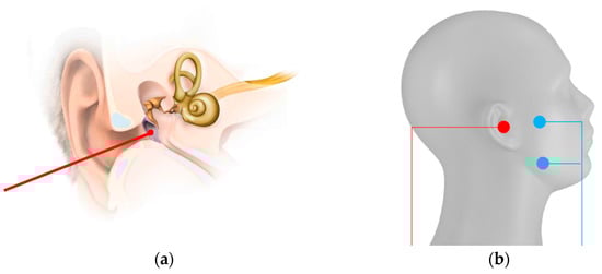 Stimulation setup for TympEALR: (a) Position of the active electrode (red) in the outer ear canal on the tympanic membrane. (b) Position of the counter electrodes (blue) on the mandibular and zygomatic arch relative to the active electrode (red). (Image sources: MED-EL, Innsbruck; modified).