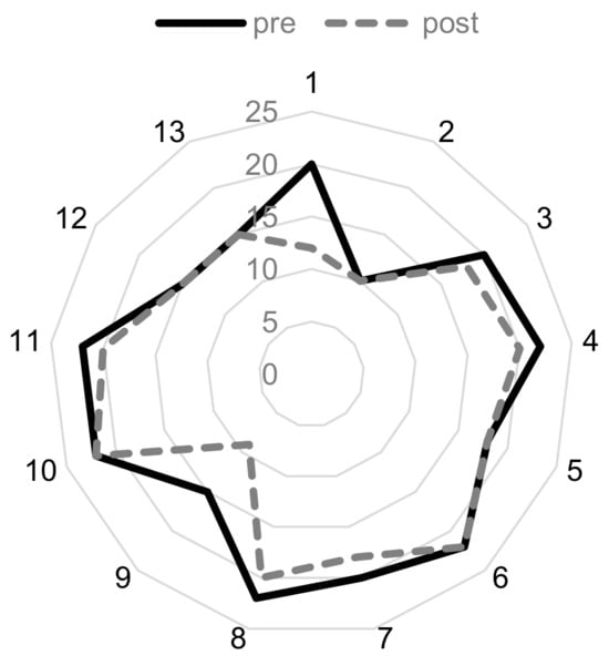 Comparison of the individual stimulation impedance in kΩ before the first stimulation at pre-testing (=pre; solid line) and after the last TympEALR recording (=post; dashed line).