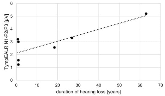 Scatter plot showing the correlation between the duration of hearing loss in years and the amplitude of N1-P2/P3 from the TympEALR in µV.