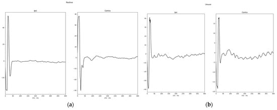 Finally, to show a typical response waveform, a total mean was plotted from a direct export of the response waveform selected as described before. The total mean of the response waveforms grouped in positive and insecure are shown in Figure 4. One example of a positive response (subject 02) and the only negative response in the investigated study group (subject 12) are shown in Figure 5.
