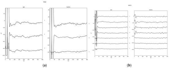 Single cases of a TympEALR (a) a positive response including all measurements (positive and negative initial stimulation phase (1st and 2nd waveforms from top) and manually averaged response (3rd waveform from top) (subject 02); (b) the only negative TympEALR in our study group (subject 12). For subject 02 and subject 12, recording channel 1 (left curves) was the contralateral side of testing = right mastoid recording electrode, and recording channel 2 (right curves) was the ipsilateral dies of testing = left mastoid recording electrode.