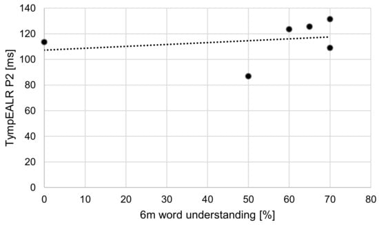 The Pearson correlation coefficient was computed to assess the linear relationship between word understanding six months after the first fitting of the cochlear implant system and P2 latency. There is no significant correlation between the two variables, r(4) = −0.25, p = 0.64. The data are shown in Figure 6.