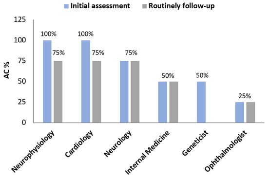 Regarding mutations, 100% of the sites followed up carriers with V50M; 75% of sites, carriers with S97Y mutation; and 50% of the centers, mutations V142I and E109K. Other mutations reported were T60A, D38E, and T68I. Initial AC evaluation was carried out by neurophysiologists and cardiologists (all centers), neurologists (75% of centers), internist physicians and geneticists (half of the centers), and ophthalmologists (25% of centers), while the routine follow-up monitoring was primarily driven by specialists in neurophysiology, neurology, and cardiology (75%) and internist physicians (50%) (Figure 1).