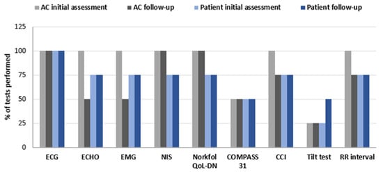 With respect to patients’ initial assessment, all centers performed ECG; 75% included ECHO, EMG, NIS, Norfolk QoL-DN, CCI, and RR interval; and 50% included COMPASS-31. At follow-up, the same tests and scales were used in the same percentages in all centers as in the first patient visit, except for the Tilt test (Figure 2). The frequency of follow-up was every 6 months for stable patients and every 3–6 months for patients under evolution (unstable).