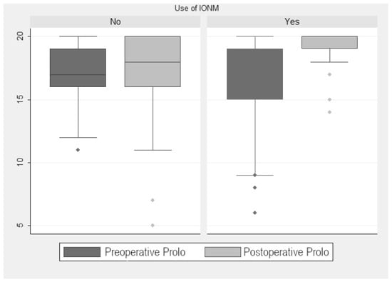 The distribution of variables analyzed in the sample (including age, tumor type, use of IONM during the surgery, pre- and postoperative Prolo scores, pre- and postoperative Brice and McKissock scores, pre- and postoperative McCormick scores, and postoperative neurological deficits) is presented in Table 6 and Table 7.
