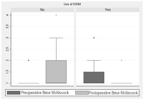 While postoperative neurological complication rates are generally lower in extramedullary tumor surgeries compared to intramedullary procedures [], the intervention for extramedullary intradural tumors is particularly important due to their proximity to the spinal cord. Monitored patients have shown up to a 17.7% benefit in previous studies [,], attributed to intraoperative adjustments based on real-time neurophysiological data, which can predict favorable outcomes in approximately 90% of cases. Our study corroborates this finding, demonstrating a lower rate of additional postoperative neurological deficits in patients who underwent IONM compared to those who did not.
