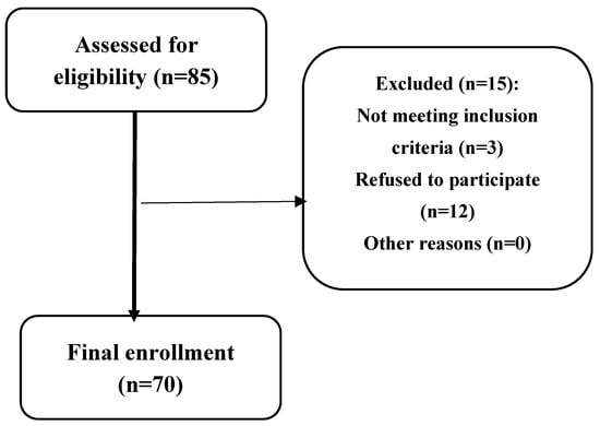 A descriptive study was conducted in the 2023 and 2024 academic years at Zefat Academic College in the north of Israel. We adopted different channels for recruiting participants to ensure a diverse sample. This included advertisements posted in the local academic institution’s social media, local department forums, and the college’s website. Out of the 85 first-year students who responded to the research invitation, 70 met the inclusion criteria and agreed to participate for this study [Figure 1]. Participants were excluded if they were (1) pregnant, (2) underwent surgery in their spine or lower extremities, (3) had neuromuscular-skeletal diseases, and/or (4) had anatomical deformities related to the spine and chest wall. A consent form, which included the purpose of the research and the right of the participant to withdraw at any time, was received from each participant. We recruited only first-year students because this research is part of a prospective study that intends to follow up with the students for 1–2 years. This study was conducted according to the Helsinki Declaration and approved by the Departmental Research Ethics Committee, Zefat Academic College (no. 2-2024).