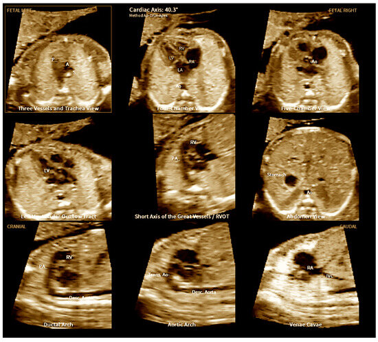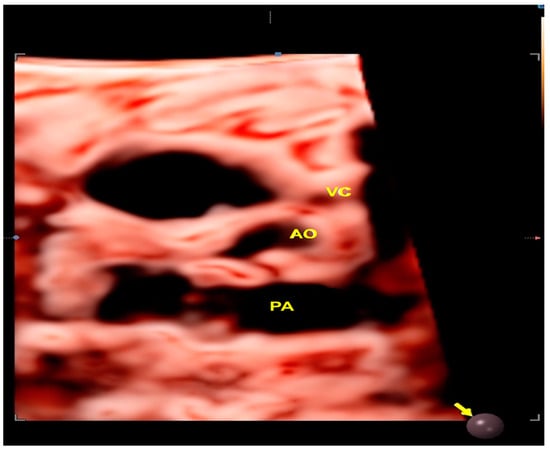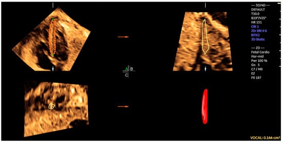The advent of three-dimensional (3D) ultrasound in the early 1990s, and in particular, four-dimensional (4D) spatio-temporal image correlation (STIC) software in the early 2000s, marked a significant turning point in the field of fetal imaging. This has enabled significant technological advancement in fetal heart assessment, particularly in the identification of atrioventricular and semilunar valve regions, as well as the delineation of interatrial and interventricular septum areas and volumes, cardiac chambers, and ventricular walls [10,11,12,13,14]. The advantages of STIC in fetal cardiac assessment include a reduced dependence on the operator’s experience in obtaining diagnostic views, a shorter examination time with the analysis of volumes conducted in the absence of the patient, and the capacity to transmit volumes for analysis to reference centers in fetal cardiology via an internet link [15]. It is possible to “navigate” within the cardiac structures by moving from one plane to another, thus enabling the cardiac anatomy to be detailed and diagnoses regarding cardiac malformations to be clarified [16,17,18].