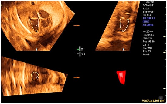 The cardiovascular score, which is based on a variety of parameters obtained from 2D Doppler ultrasound, enables the assessment of fetuses who are at risk of developing heart failure. Nevertheless, at the initial stages of myocardial dysfunction or even to provide detailed cardiac function assessment, 4D ultrasound with STIC can assist in the evaluation of STIC-M, tricuspid annular plane systolic excursion (TAPSE), and mitral annular plane systolic excursion (MAPSE), which are parameters that assess systolic dysfunction at an earlier stage than the filling fraction or the calculation of the ejection fraction by virtual organ computer-aided analysis (VOCAL) (Figure 17 and Figure 18/Videos S2 and S3). This can be beneficial in cases of diabetic fetuses and fetuses with vascular malformations such as Galen, tumors, and other conditions. Therefore, functional parameters (stroke volume, cardiac output, and ejection fraction) can be assessed using the STIC with VOCAL. Each ventricular volume is measured at the end of diastole (maximum volume) and at the end of systole (minimum volume). The caliper is positioned inside the basal and apical ventricular regions. After six sequential plans, manually delineated for each ventricle, VOCAL provides the chamber volume and reconstructs its 3D image. Finally, the stroke volume, cardiac output, and ventricular ejection fraction values are calculated for each ventricle [73,74,75,76,77].