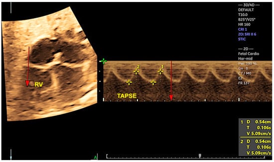 Evaluation of the tricuspid annular movement using fetal STIC-M (5.4 mm). TAPSE: tricuspid annular plane systolic excursion; RV: right ventricle.