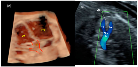 Three-dimensional ultrasound with STIC: (A) HDlive mode, providing a reconstruction of the left ventricular outflow tract in a case of transposition of the great arteries and (B) with color Doppler in a first-trimester fetus with tetralogy of Fallot. Observe the pulmonary artery (P) arising from the left ventricle (LV) in image (A) and the overriding of the aorta (A) in image (B). RV: right ventricle; LV: left ventricle; VSD: ventricular septal defect; IVS: ventricular septum.
