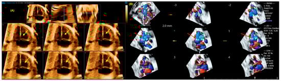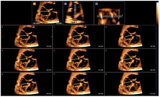 Tomographic ultrasound imaging (TUI) in the rendering mode enables the visualization of sequential axial planes in the case of inlet ventricular septal defect (VSD) (yellow arrows).