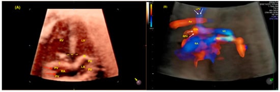 - Bravo-Valenzuela, N.J.M.; Peixoto, A.B.; Araujo Júnior, E. Prenatal diagnosis of total anomalous pulmonary venous connection: 2D and 3D echocardiographic findings. J. Clin. Ultrasound 2021, 49, 240–247. [Google Scholar] [CrossRef] [PubMed]