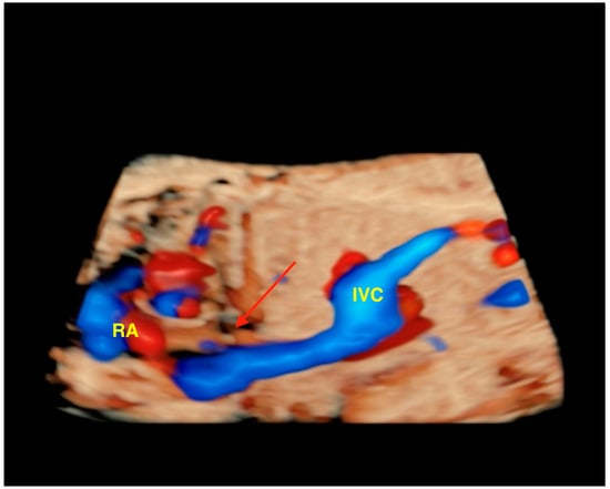 In general, persistence of the right umbilical vein (PRUV) is a benign anatomic variant; however, it could be associated with cardiac and extra cardiac anomalies (trisomy 18, monosomy X, genitourinary and central nervous system anomalies, septal and conotruncal anomalies) [53,54]. Extra-hepatic forms of PRUV are associated with agenesis of ductus venosus (ADV) and a poor prognosis [55]. Indeed, ADV is associated with cardiac and extracardiac malformations, requiring a rigorous examination of the fetal anatomy and comprehensive testing for chromosomal anomalies, including trisomies 13, 21, 18, and monosomy X. The extrahepatic form of ADV is associated with a poorer prognosis and an elevated risk of hydrops [56,57]. In this scenario, the use of 3D color Doppler is beneficial for illustrating the spatial course of the vessels and the absence of flow through the DV (Figure 9). This can assist in predicting prognosis, identifying associated malformations, and providing parental guidance.