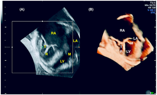 Three-dimensional with STIC in the rendering mode (A) and HDlive mode (B) of a fetus with Ebstein’s anomaly at 30 weeks of gestation. RA: right atrium; T: tricuspid valve; RV: right ventricle; LA: left atrium; M: mitral valve LV: left ventricle.