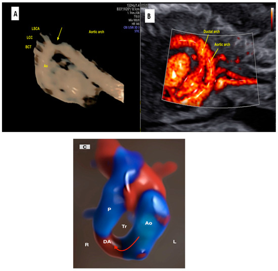 Regarding vascular anomalies, STIC navigation with HDlive Silhouette, the post-processing inversion mode, high-resolution color Doppler such as HDlive flow, and LumiFlow techniques enable the detailed reconstruction of aortic and ductal arches with realistic images (Figure 15). In this scenario, anomalies of the laterality of the aortic arch, the origin of the vessels, and the vascular ring can be more easily clarified (Video S1) [65,66,67,68].