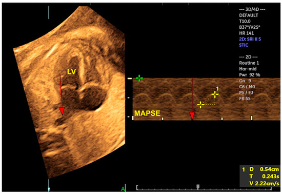 STIC-M enabling the measurement of mitral annular plane systolic excursion (MAPSE) (5.4 mm). LV: left ventricle.