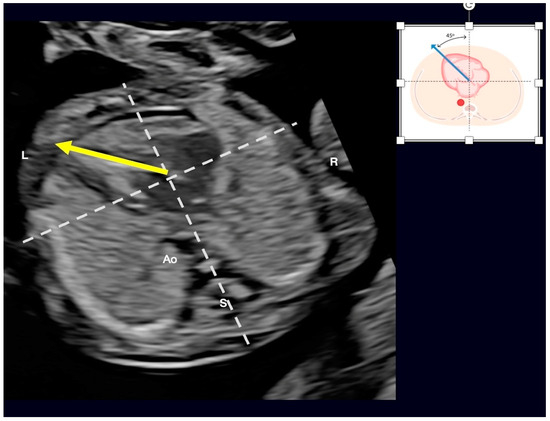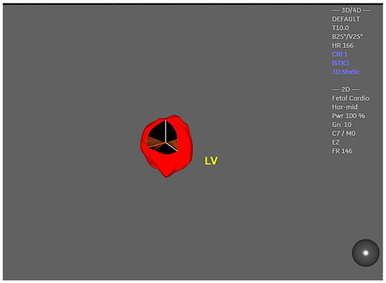 The advent of fetal echocardiography approximately forty years ago has facilitated the study of embryonic development, morphology, biometry, and fetal heart function. Since 2003, 4D ultrasound with spatio-temporal image correlation (STIC) has enabled detailed digital assessment of the fetal heart. STIC technology, initially described by De Vore et al. [10], enables the acquisition of cardiac volumes using a volumetric transducer over a single scan period of 7.5 to 15 s, with the acquisition of 150 images per second. The reconstruction of these images in 3D, correlated to time (STIC), allows the image of the fetal heart in motion to be presented with high definition (cineloop). This technology allows for navigation through the valves, cavities, and vessels of the fetal heart, thereby facilitating an anatomical and functional detailed examination of the fetal heart [10,31]. Although this methodology is already familiar to practitioners, it is important to reiterate that to obtain high-quality cardiac volumes from the images used for the study of the fetal heart with STIC, it is recommended that the fetal spine is positioned at 6 o’clock (posterior dorsum) with an opening angle between 20° and 40° [32]. This is because unfavorable fetal statics, such as an anterior fetal dorsum and fetal movement during examination, can limit the accuracy of the image and pose a challenge to this technology, in a similar manner to two-dimensional (2D) ultrasound [33].