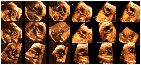 - Rubert, N.C.; Jategaonkar, G.; Plasencia, J.D.; Lindblade, C.L.; Bardo, D.M.E.; Goncalves, L.F. Four-dimensional fetal cardiac imaging in a cohort of fetuses with suspected congenital heart disease. Pediatr. Radiol. 2023, 53, 198–209. [Google Scholar] [CrossRef] [PubMed]