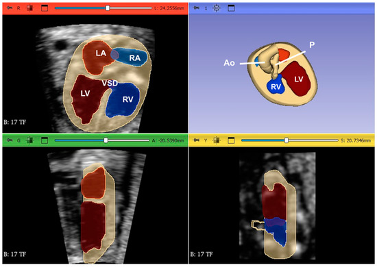 Following the acquisition of images of the fetal heart with tetralogy of Fallot from 3D ultrasound (heart volumes) using tools from Slicer 3D software (Birmingham, UK), the cardiac structures were segmented, with each cavity identified by a different color (right and left atrium, right and left ventricles, aorta, pulmonary artery, vena cava and pulmonary veins). Thereafter, a raw file format was generated. Based on the 3D data, physical 3D models of the fetal heart were printed using a 3D printer. Ao: aorta; LA: left atrium; P: pulmonary artery; RA: right atrium; LV: left ventricle; RV: right ventricle; VSD: ventricular septal defect.