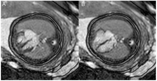 (A) Fetal cardiac MRI (fCMR) performed at 32 weeks and 5 days. Images were obtained at 1.5 T using a balanced turbo field echo (BTFE) sequence, gated with an MRI-compatible Doppler ultrasound (DUS) device (North Medical, Hamburg, Germany). Four-chamber view in systole (A) and diastole (B). LA: left atrium; LV: left ventricle; RA: right atrium; LA: left atrium.