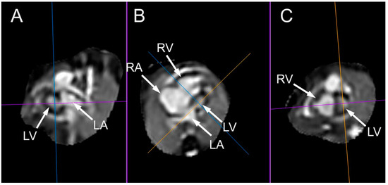 Multiplanar display images of a case of hypoplastic left heart syndrome examined at 32 weeks and 3 days. The images were acquired using a balanced turbo field echo (BTFE) sequence at 1.5 T. kt-sense acceleration was used during acquisition. The images were postprocessed using a super-resolution pipeline, resulting in an isovoxel 3D volume dataset. (A) Sagittal two-chamber view. (B) Four-chamber view. (C) Coronal short-axis view through the ventricles. LA: left atrium; LV: left ventricle; RA: right atrium; RV: right ventricle.