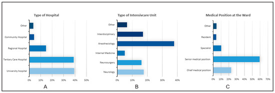 Results of the questions regarding the type of hospital, ICU, and medical position on the ward. The X-axis represents the percentage of answers we received for each answer aligned on the Y-axis. (A) indicates the proportions of different types of hospitals. (B) shows what medical discipline leads the ICU. (C) highlights the contribution of the medical position of the respondents.