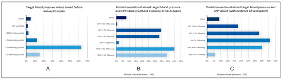 Results of the questions regarding target blood pressure and CPP values in patients with aSAH. The X-axis represents the percentage of responses we received for each answer shown on the Y-axis (systolic blood pressure, CPP and MAP). (A) indicates the target systolic blood pressure before treatment of the aneurysm. (B) indicates target blood pressure after aneurysm repair when no signs of vasospasm appeared. (C) shows target blood pressure after aneurysm repair under the condition of vasospasm. For questions B and C, multiple-choice answers were allowed. Most respondents indicated they would aim to keep the blood pressure before aneurysm repair below 140 mmHg, post-intervention MAP > 90–100 mmHg, and post-intervention with vasospasm MAP > 100 mmHg and CPP > 70–90 mmHg.