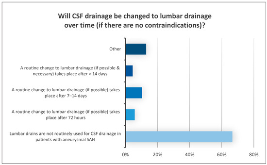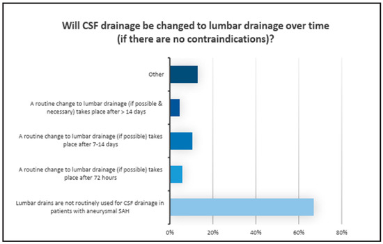 Results: Results of the question regarding the transition from CSF drainage via EVD to lumbar drainage over time. The X-axis represents the percentage of responses we received for each answer shown on the Y-axis (different time frames for the change in EVD usage), indicating that lumbar drains are still not part of routine practice.